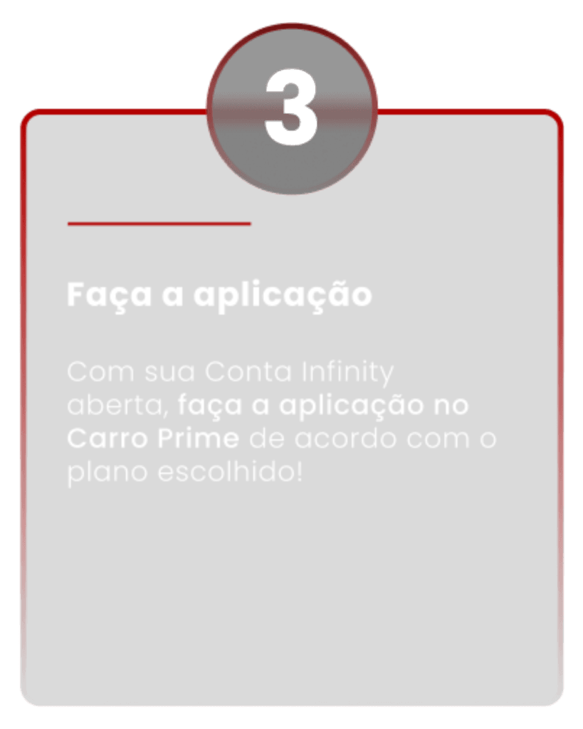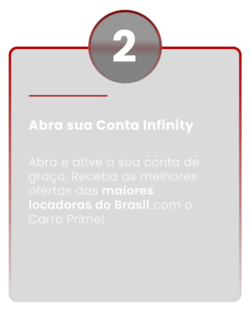 Comece se cadastrando gratuitamente para receber propostas de assinatura de veículos das maiores locadoras do Brasil com as melhores ofertas. Enquanto isso, abra a sua conta digital infinitamente gratuita na Conta Infinity. Será através desta conta que você contratará o seu plano preferido do Carro Prime e fará a sua aplicação.